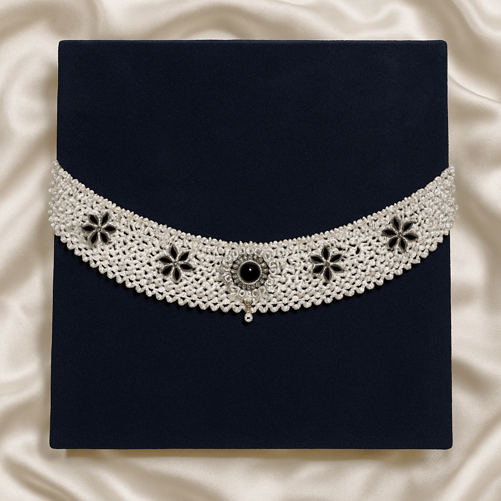 Ditch the usual reds and greens—this monochrome stunner is for those who love elegance with an edge. Crafted with high-quality white imitation beads, this handcrafted choker features sleek black floral motifs that instantly elevate its look. The centerpiece is a statement in itself: a silver-toned flower design encrusted with sparkling white stones, anchored by a bold black center stone. The black-and-white contrast is dramatic, stylish, and effortlessly versatile—perfect for pairing with both traditional and contemporary outfits.