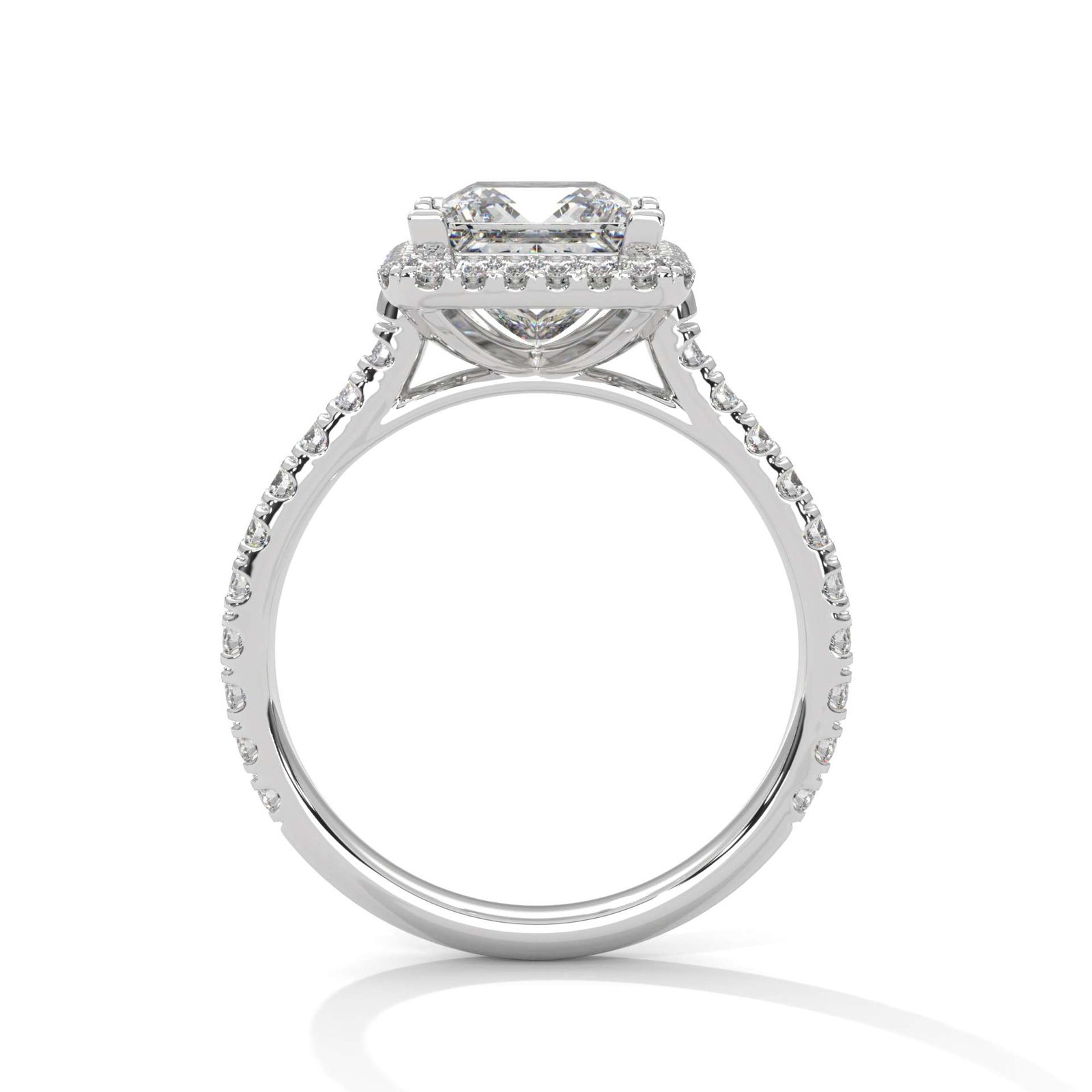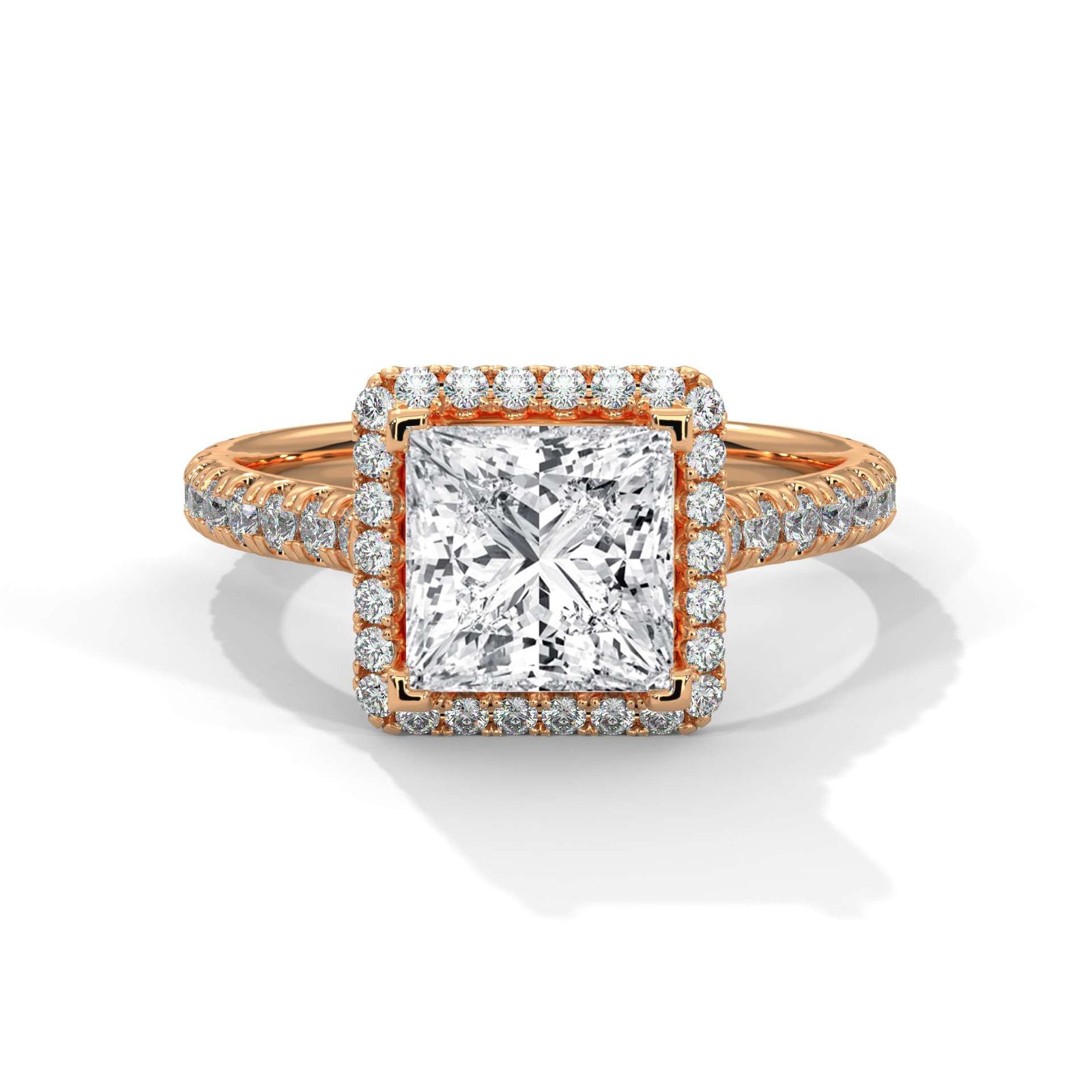 Bold. Brilliant. Timeless. The Celeste Princess Halo Ring features a dazzling 7×7 mm princess-cut center diamond (approx. 2.00 ct), encircled by a sparkling halo and pavĂ© band of 46 round diamonds totaling 0.57 ct. The perfect fusion of elegance and grandeur.