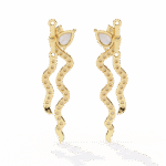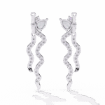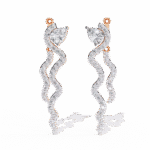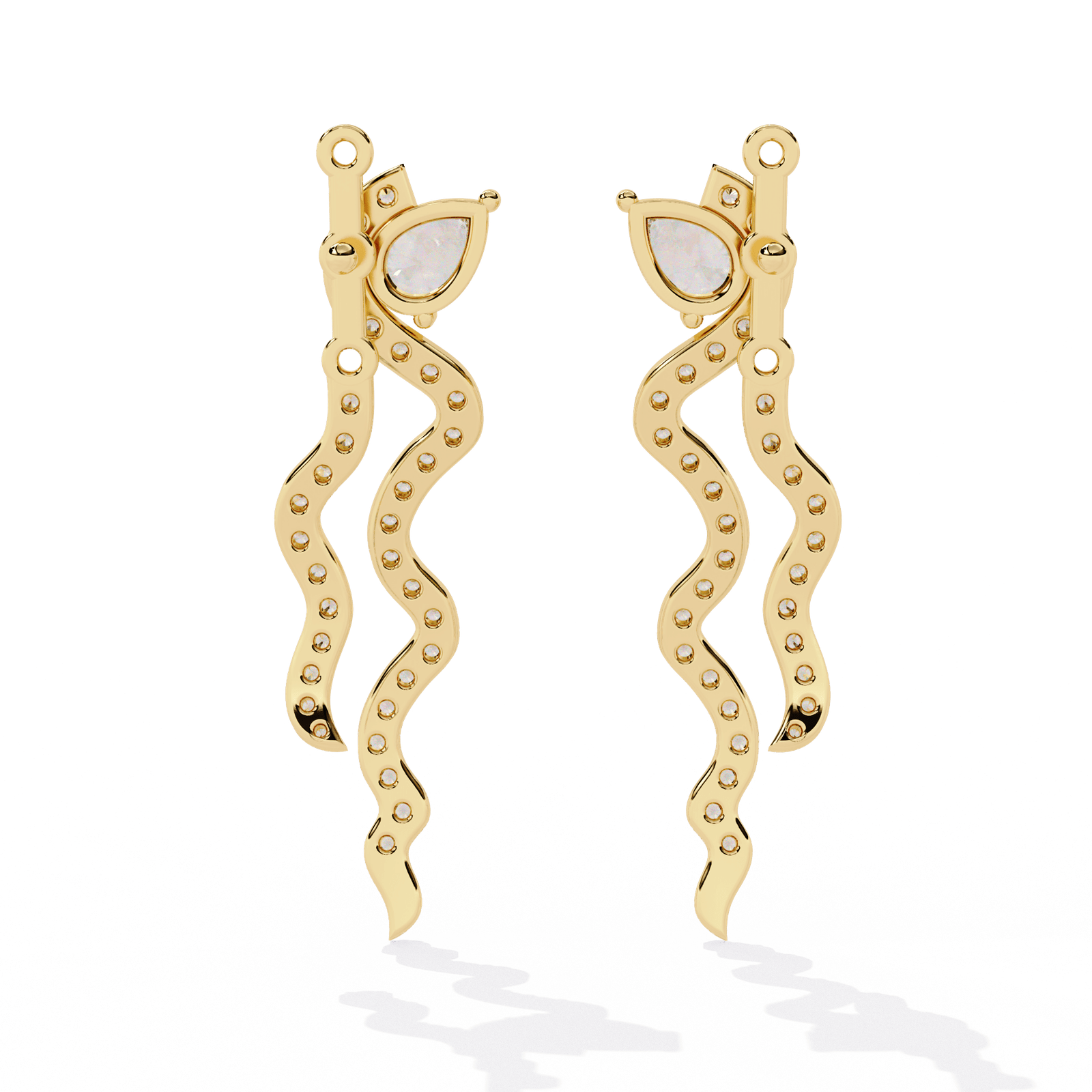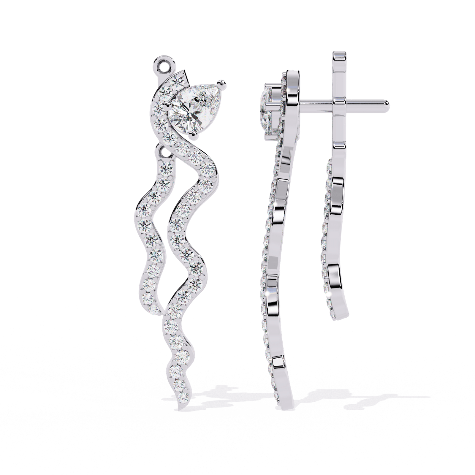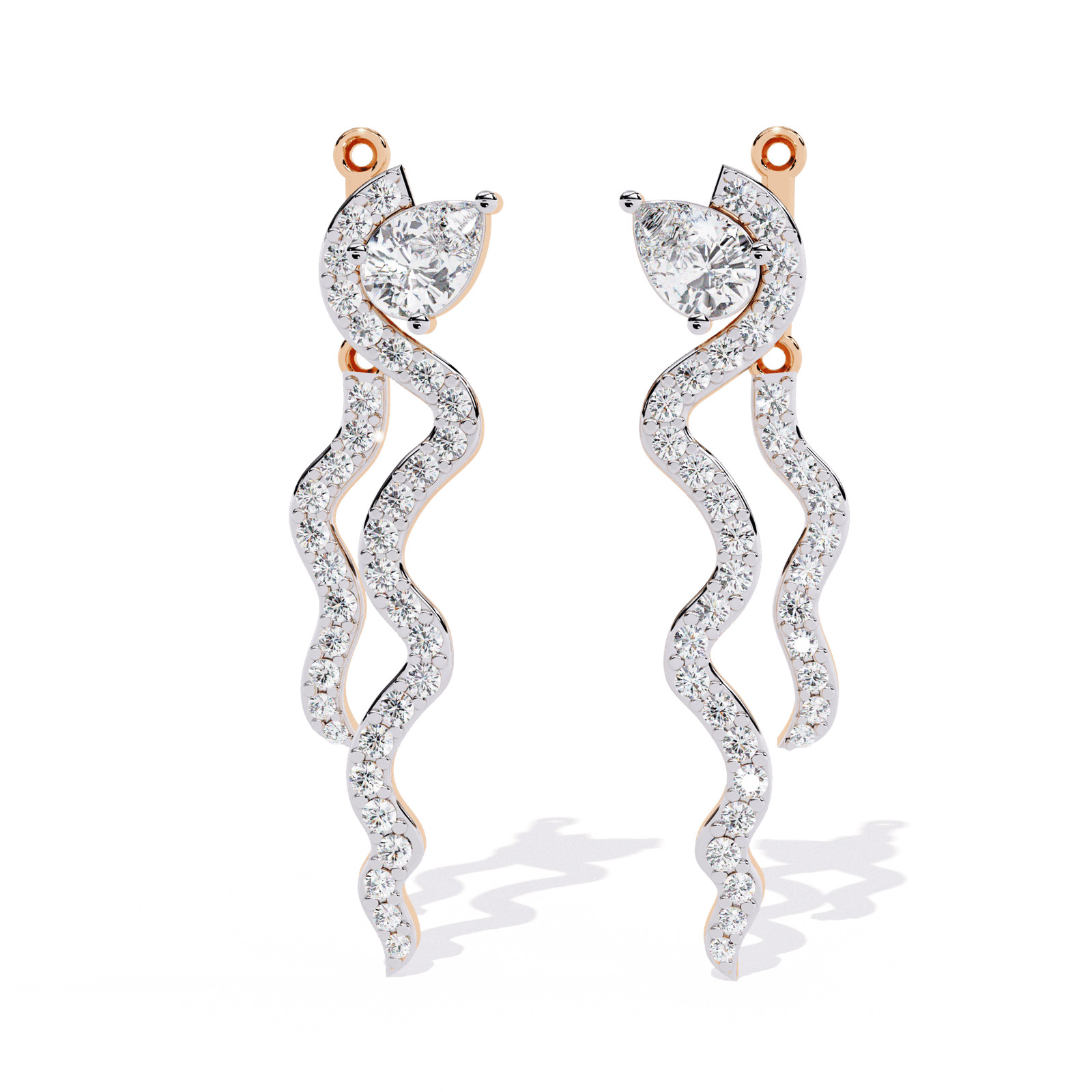 Inspired by the gentle movement of water and the elegance of cosmic patterns, these earrings shimmer with a poetic rhythm. Crafted in your choice of gold or rose gold, the design features dual wavy strands lined with brilliant round diamonds, anchored by a pear-shaped solitaire at the top. Weighing 4.13 grams with a total diamond carat of 0.84, this piece is a perfect harmony of grace and glamour — ideal for evening affairs or moments that call for a touch of stardust.