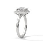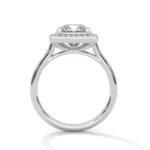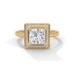 The Princess Cut Halo Ring showcases a striking 7.00 x 7.00 mm princess-cut center diamond, framed by a delicate halo of brilliant round diamonds for extra sparkle and bold symmetry.